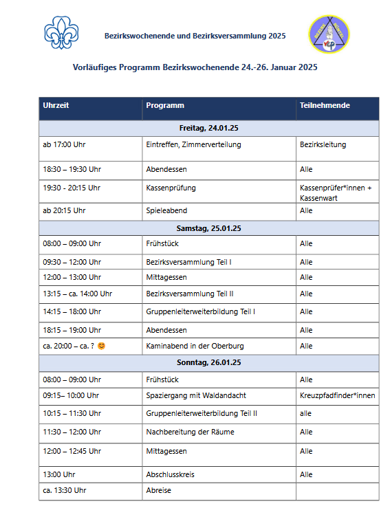 Bezirksversammlung 2025 Quelle: Einladung Bezirk Süntel WP Beginn 24.01.2025 Ende 26.01.2025 Ort Burg Sternberg